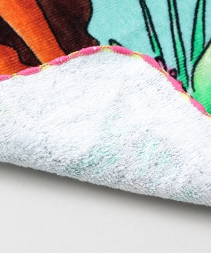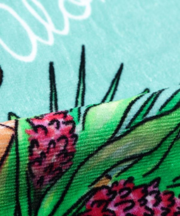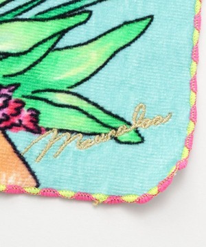 メロー刺繍でふちどられたカラフルで鮮やかなデザイン。柔らかな肌触りのタオルで、裏面はパイル地で吸水性も良い一枚です。ハワイの花々を摘んだバスケットを持った姿はまるで夢を運んでいるよう。