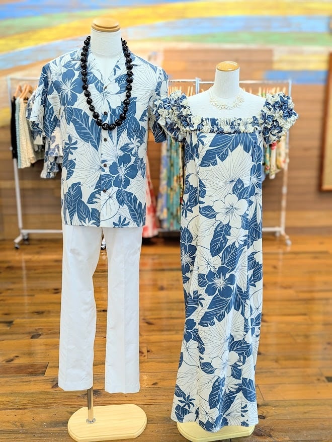 ハイビスカスフラワーやタロなどのハワイアンモチーフをクールなブルーカラーでプリントしたアロハシャツです!コットン100%なので、さらっとした着心地です。