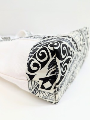 真っ白なキャンバス地に、ハワイアンタトゥーのようなブラックのテキスタイルが映える上品なトートバッグ。持つだけで日常にリゾート感をプラスし、大人のカジュアルスタイルを格上げしてくれます。ランチタイムのちょっとしたお出かけから、ショッピング、旅行まで。様々なシーンで活躍する絶妙なサイズ感で内ポケットも付いていて、機能性もバッチリ。