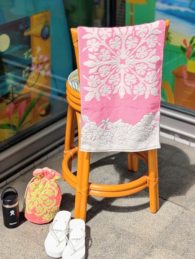 ハワイの代表的な植物をモチーフにしたハワイアンキルト柄のフェイスタオルです。