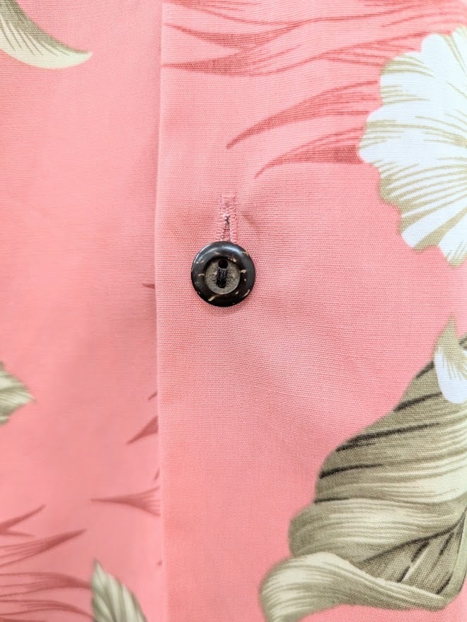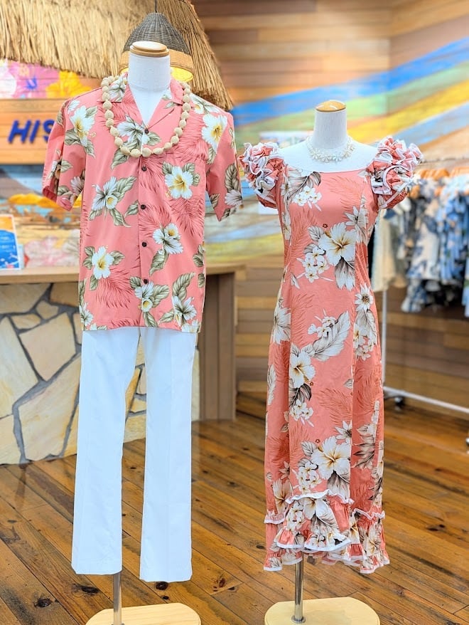 南国の太陽を思わせるピーチピンクのカラーが目を引く、華やかなアロハシャツです。 落ち着いた色味と繊細なタッチで描かれたホワイトハイビスカスのコントラストが、大人のリゾートスタイルを演出します。顔写りが明るく見えるピンクは、屋外のロケーションでもとっても映えます。