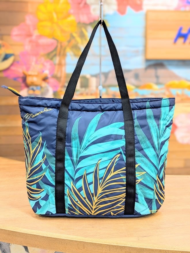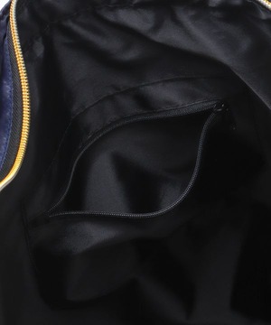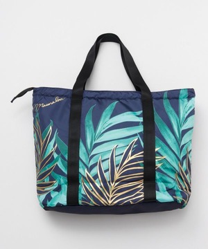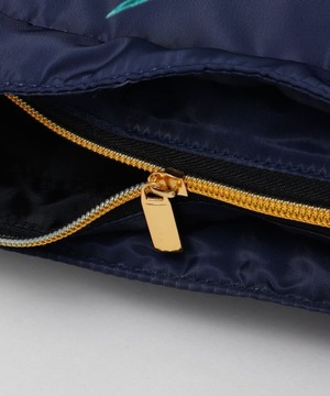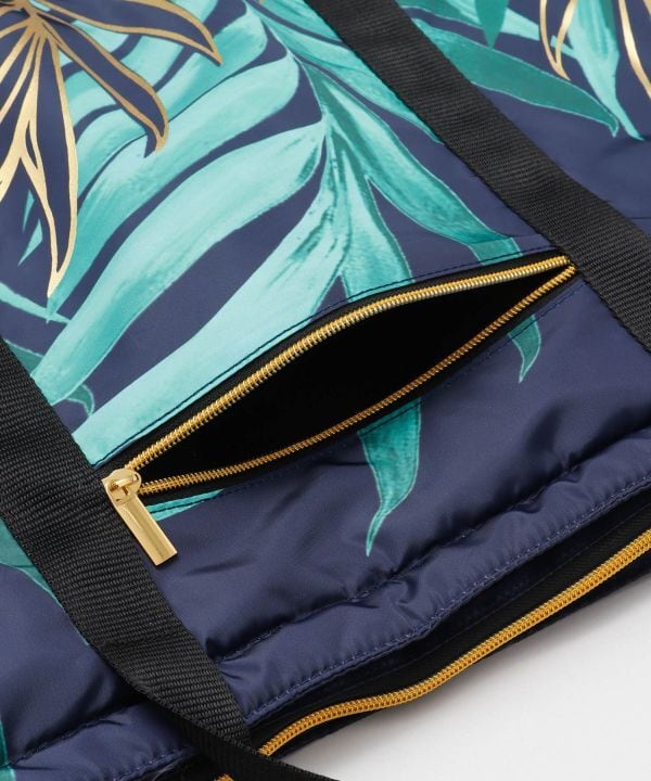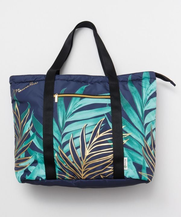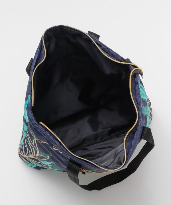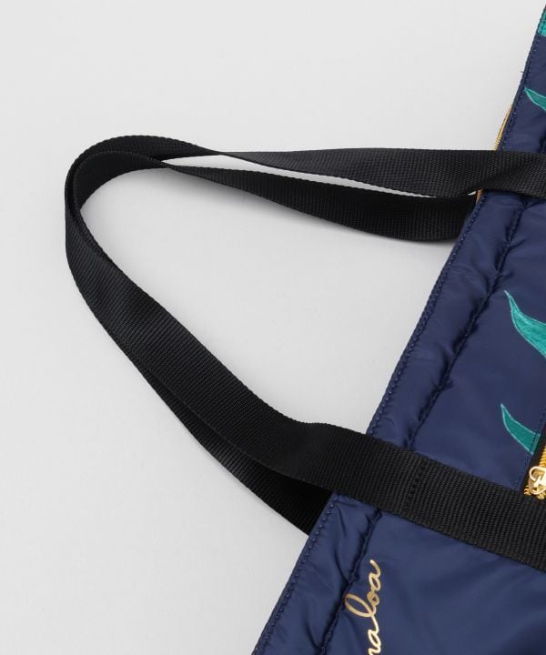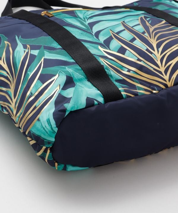 中綿でふんわりした質感で軽く、レッスン着のほかに楽器などを入れるのにもおすすめです。ファスナーの外ポケットが1つ、内ポケットは2つ付きで機能性もあり、取っ手も長めなので肩掛けもできます。立体的に描かれたリーフが魅力的なデザインです。