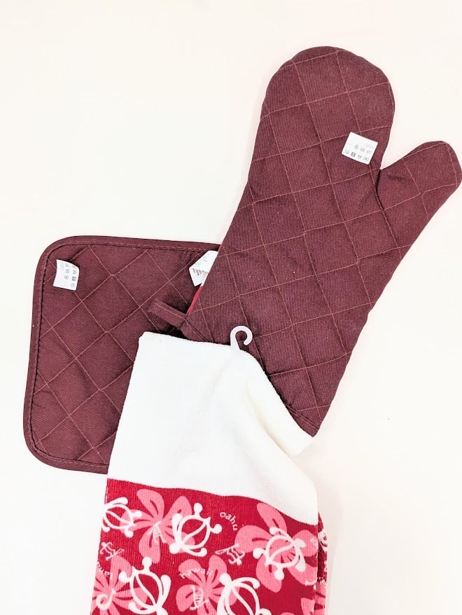 サイズ:<鍋敷き>20.5㎝×20.5㎝ <ミトン>30㎝×17cm <タオル>40×64㎝
