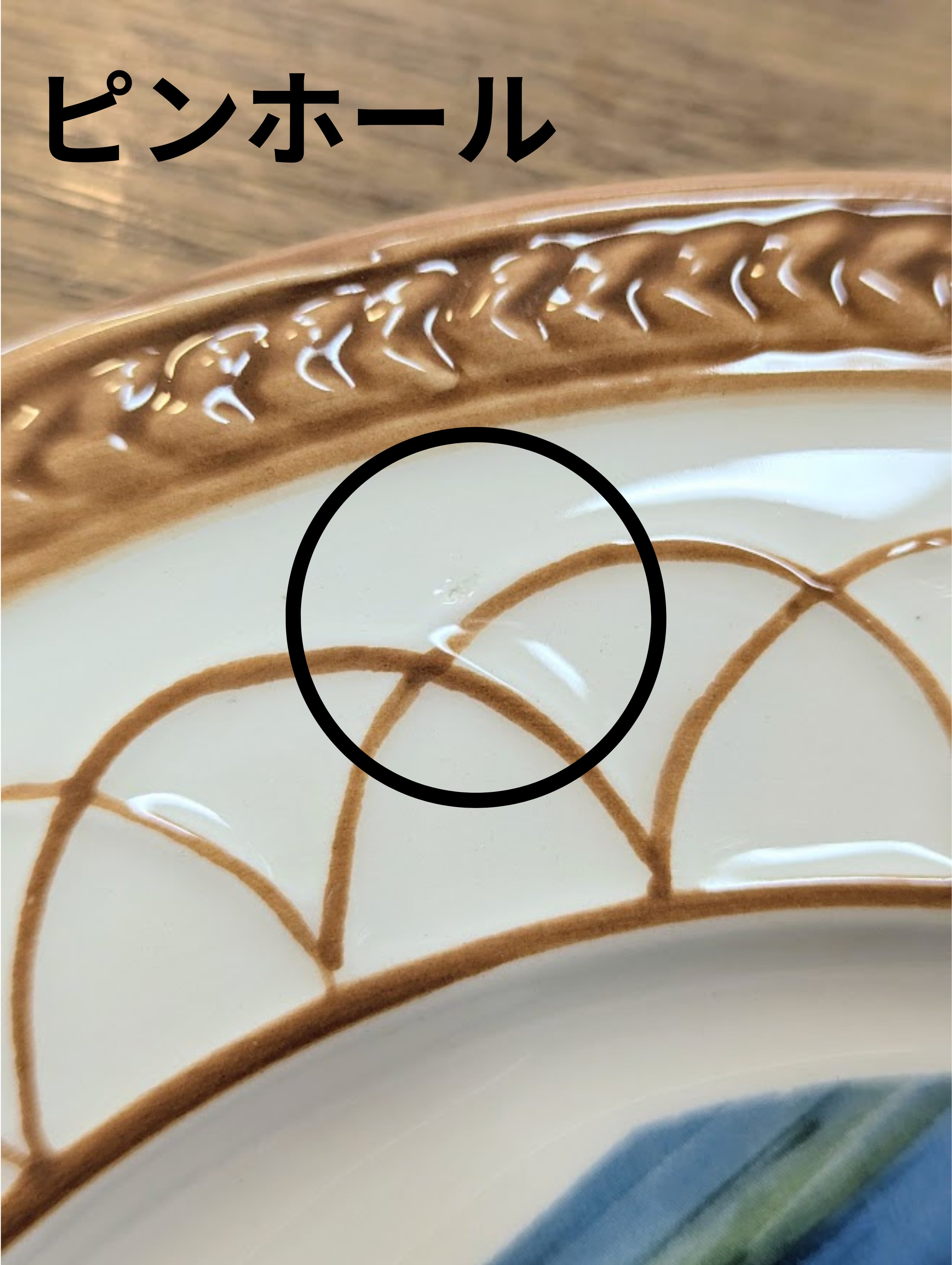 ・釉薬が小さな泡のように膨らんで固まった突起が見られることがあります。これは焼成中に生じる現象で、ご使用に問題がない限り、焼き物の風合いとして良品の範疇とさせていただいております。縁や側面の釉薬は、かかる際に均一にならないことがあります。釉薬が薄くかかっている部分や、途中で切れて素地が見えている部分、あるいは釉薬が溜まって厚くなっている部分がございますが、これらは焼成工程で生じる陶磁器特有の表情です。