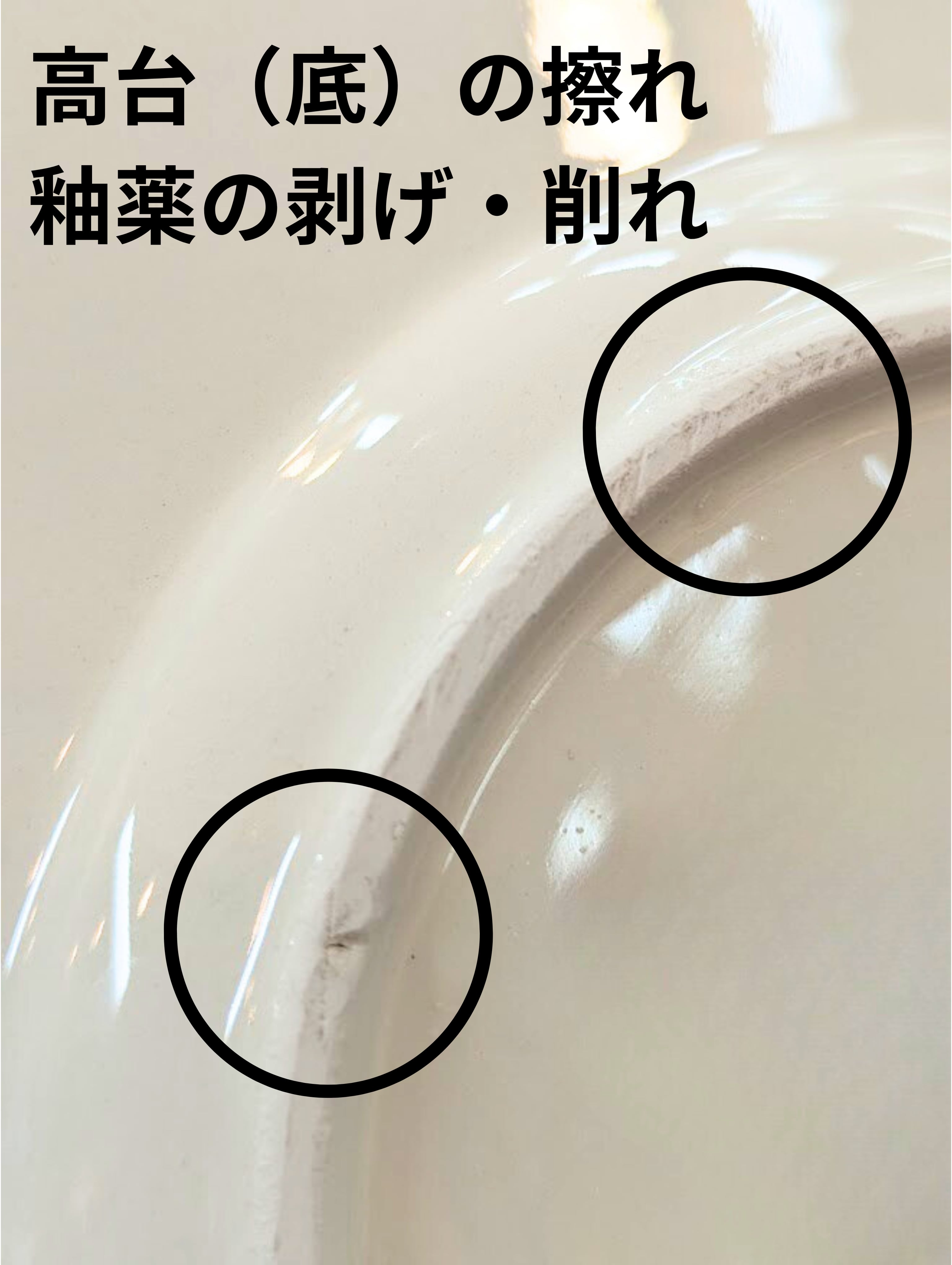 ・高台や縁の裏側など、釉薬が薄くかかっている部分や、製造工程で削られた部分に、微細な凹凸や、釉薬の剥げが見られる場合があります。ご使用に問題のない範囲は良品としております。また高台の接地部分には、小さな突起やざらつきが残っていることがあります。テーブルを傷つける可能性がご心配な場合は、敷物(ランチョンマットなど)のご利用をおすすめします。
