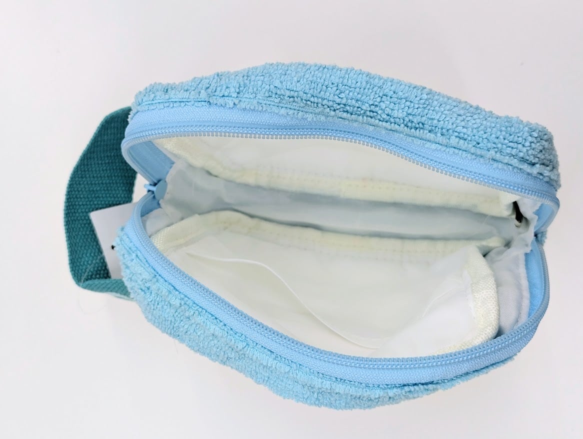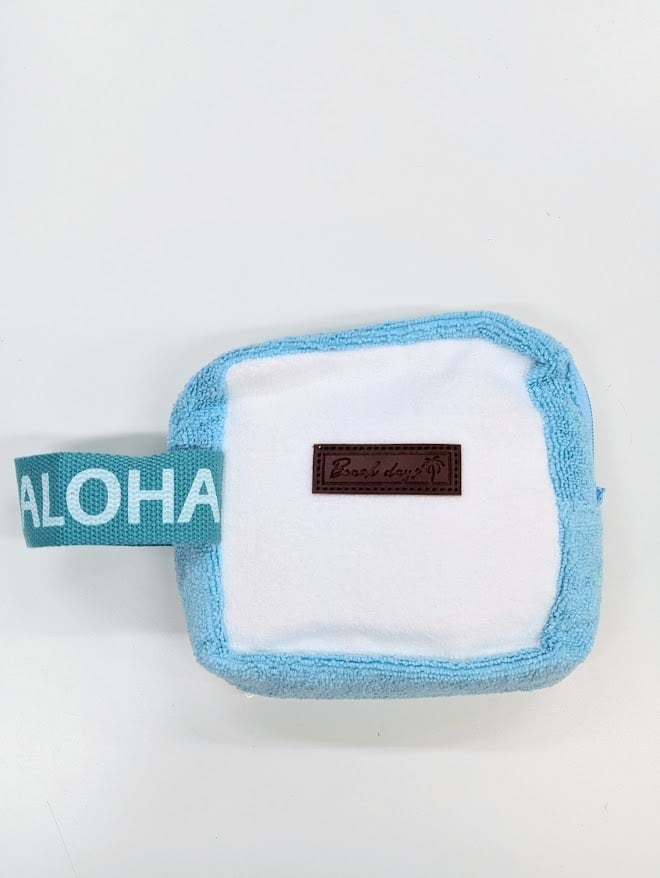 触り心地バツグンのふんわりパイル地(タオル地)を使用。まるでリゾートにいるような、爽やかな気分にしてくれます。後ろにはレザー調のワンポイントがあり、便利なループも付いています。マチがしっかりあるキューブ型なので、見た目以上に収納力があります。