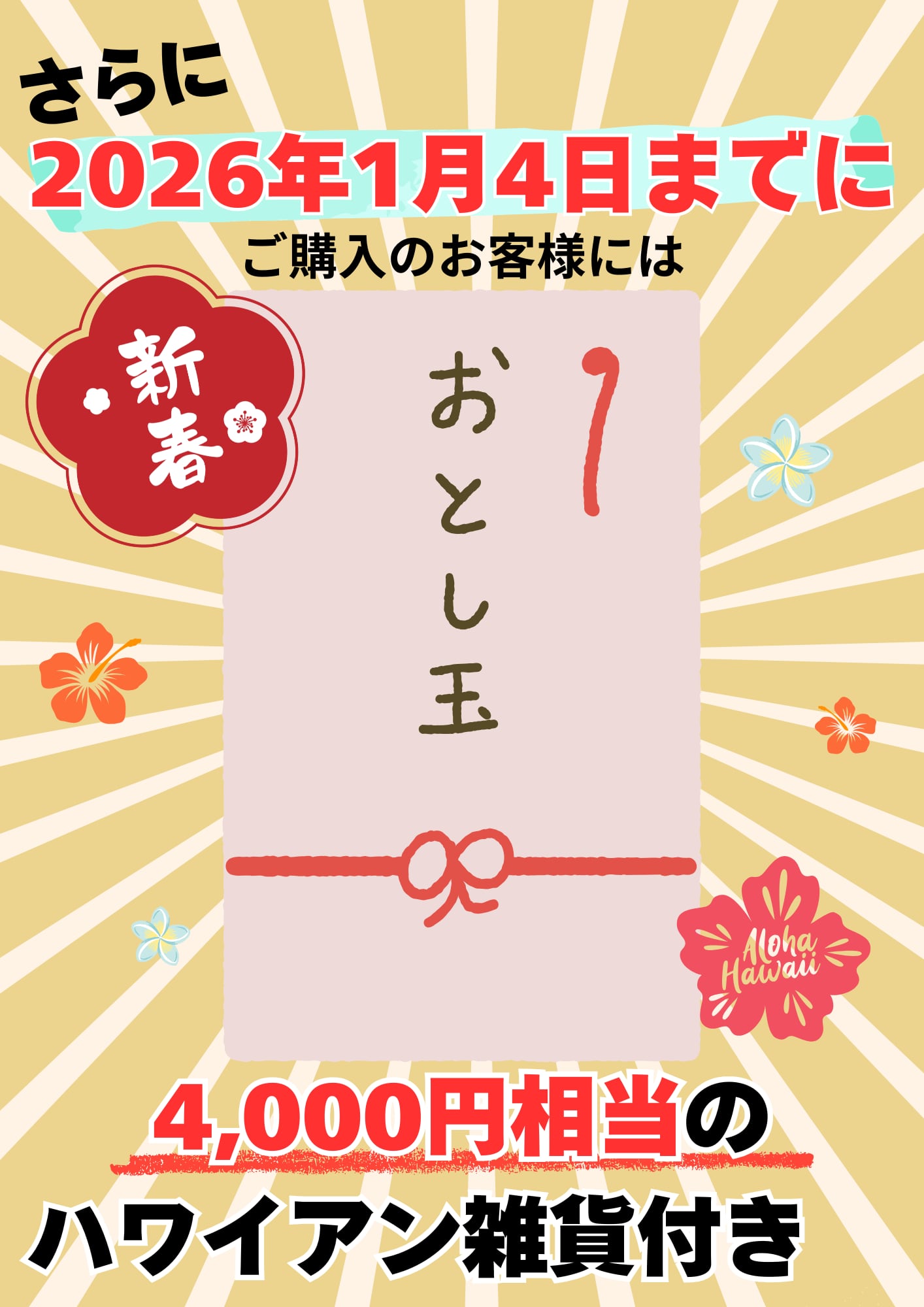 1月4日までにご購入のお客様には新春お年玉特典☆開けてお楽しみ!4,000円相当のハワイアン雑貨入り!!!