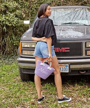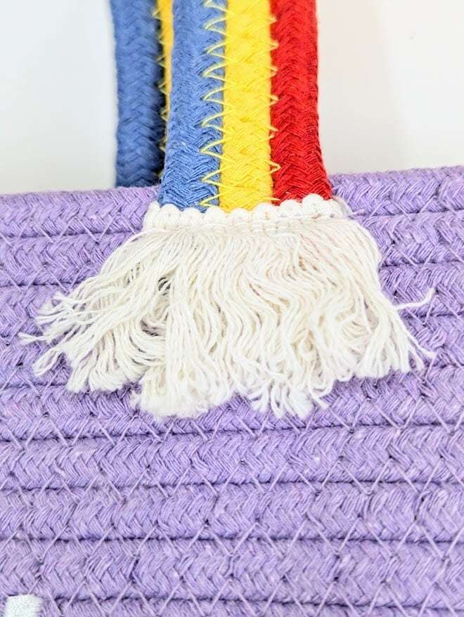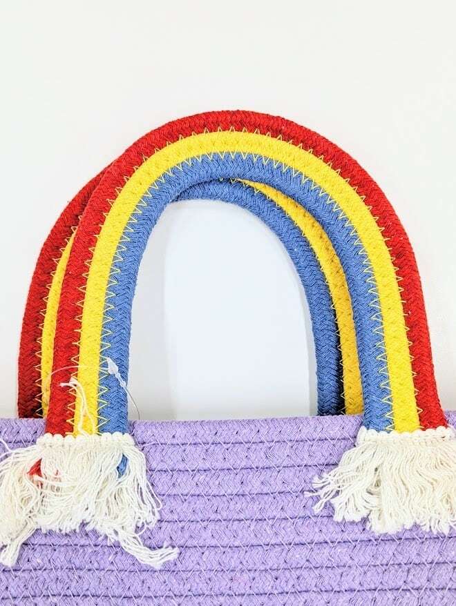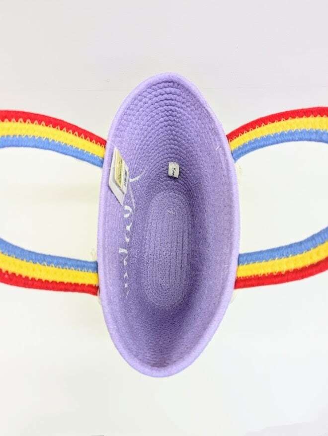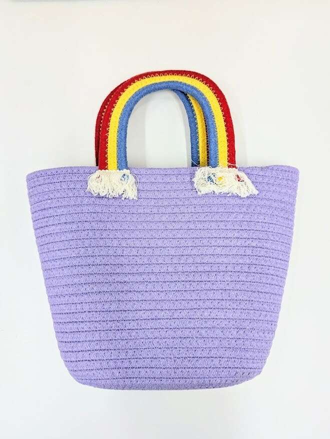 白のフリンジの部分が雲を連想させ、色合いもカラフルで気分が上がるバッグです。軽くて使いやすく、500mlの水筒もすっぽり入る大きさです。お散歩やショッピングにぴったりです。