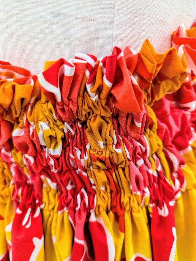 上質ポリコットンでシワになりにくく、生地に張りがあるため踊っている時にとても綺麗です☆赤、オレンジ、黄色などの暖色系を中心としたグラデーションのような色合いで、見ているだけで心躍るような気持ちになるとても鮮やかでトロピカルな雰囲気のパウスカートです。