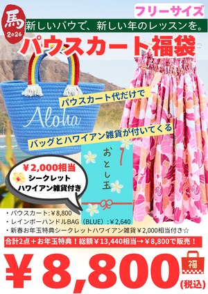 今だけパウスカート代金【8,800円】だけで、①レインボーハンドルが可愛いバッグ ②新春お年玉特典☆開けてお楽しみ!2,000円相当のハワイアン雑貨入り!!!がこれらが全部【無料(タダ)】で手に入る大チャンス!