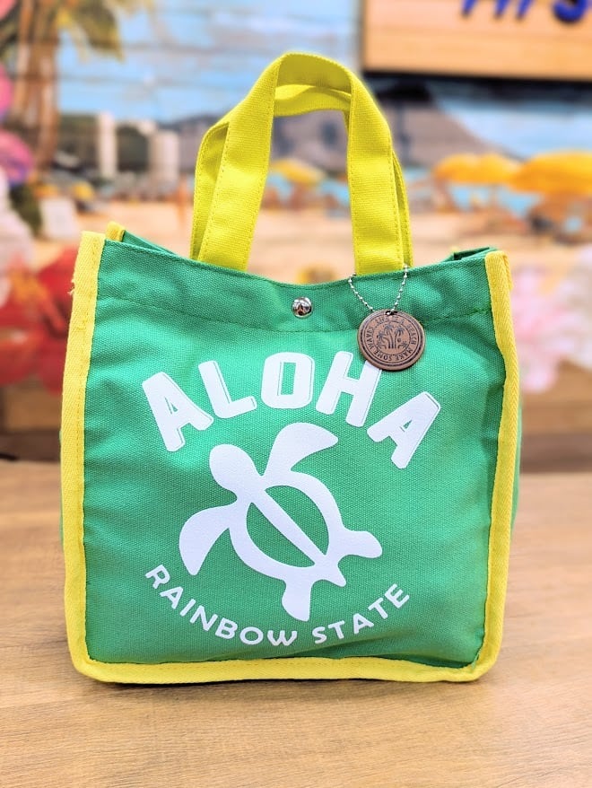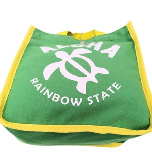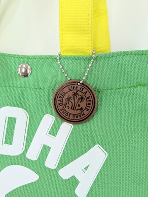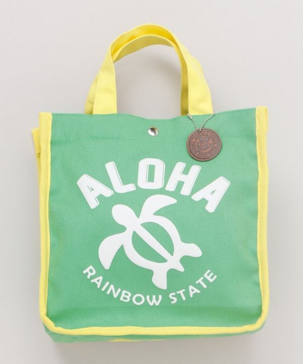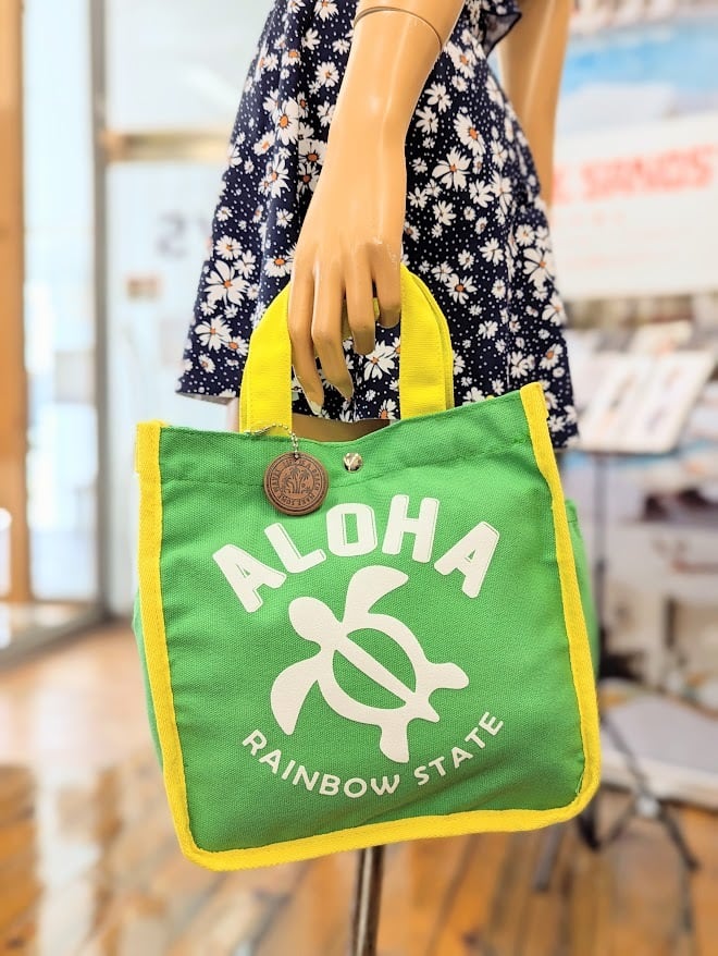 持つだけで気分はハワイ!「ALOHA」ホヌ柄ミニトートバッグは便利なサイドポケットが2個ついており、ヤシが刻印された合皮のチャームもポイント。ハワイを連想させるデザインが発泡プリントで施され,お出かけをより一層楽しくさせてくれます。内ポケット付き。