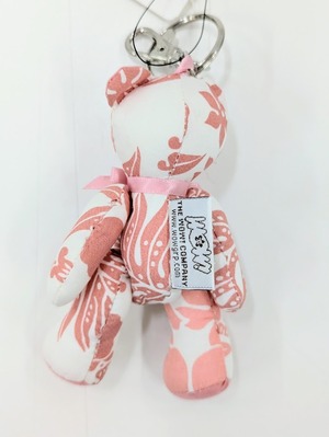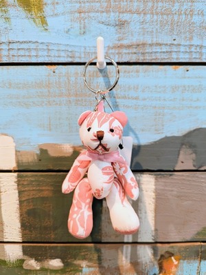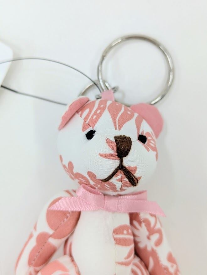 ハワイの「ピンクパレス」をイメージさせる、華やかなピンクのアロハプリントを纏ったベアキーホルダーです。 ひとつひとつ柄の出方が異なる、世界にひとつだけの表情が魅力。 首元の愛らしいリボンと、優しいピンクの色合いが、手にするたびにハワイの心地よい風を思い出させてくれます。