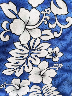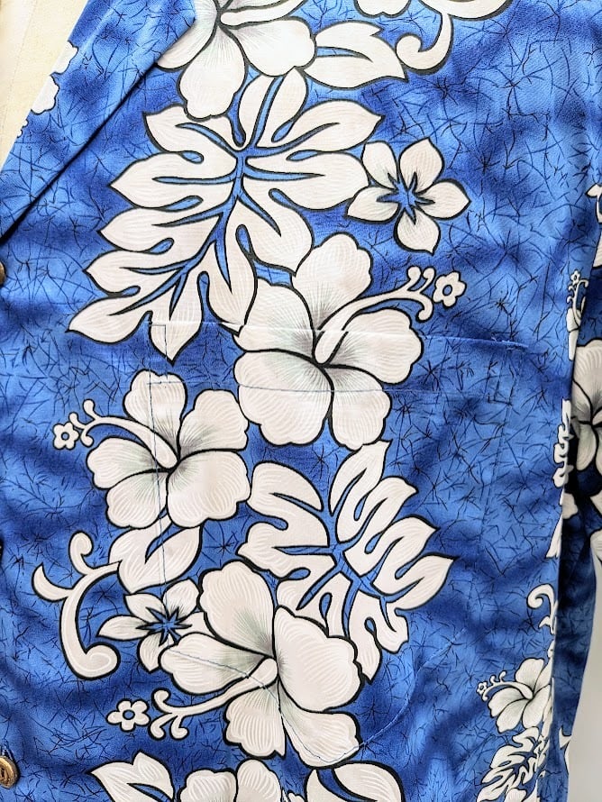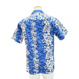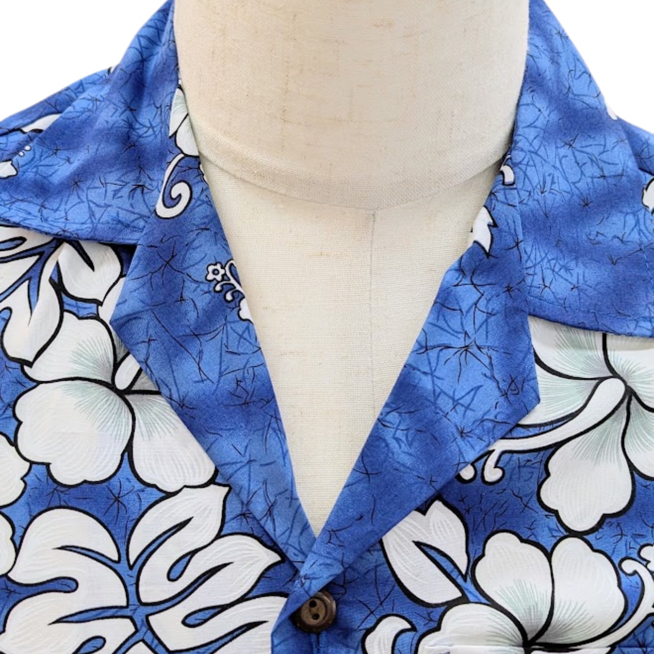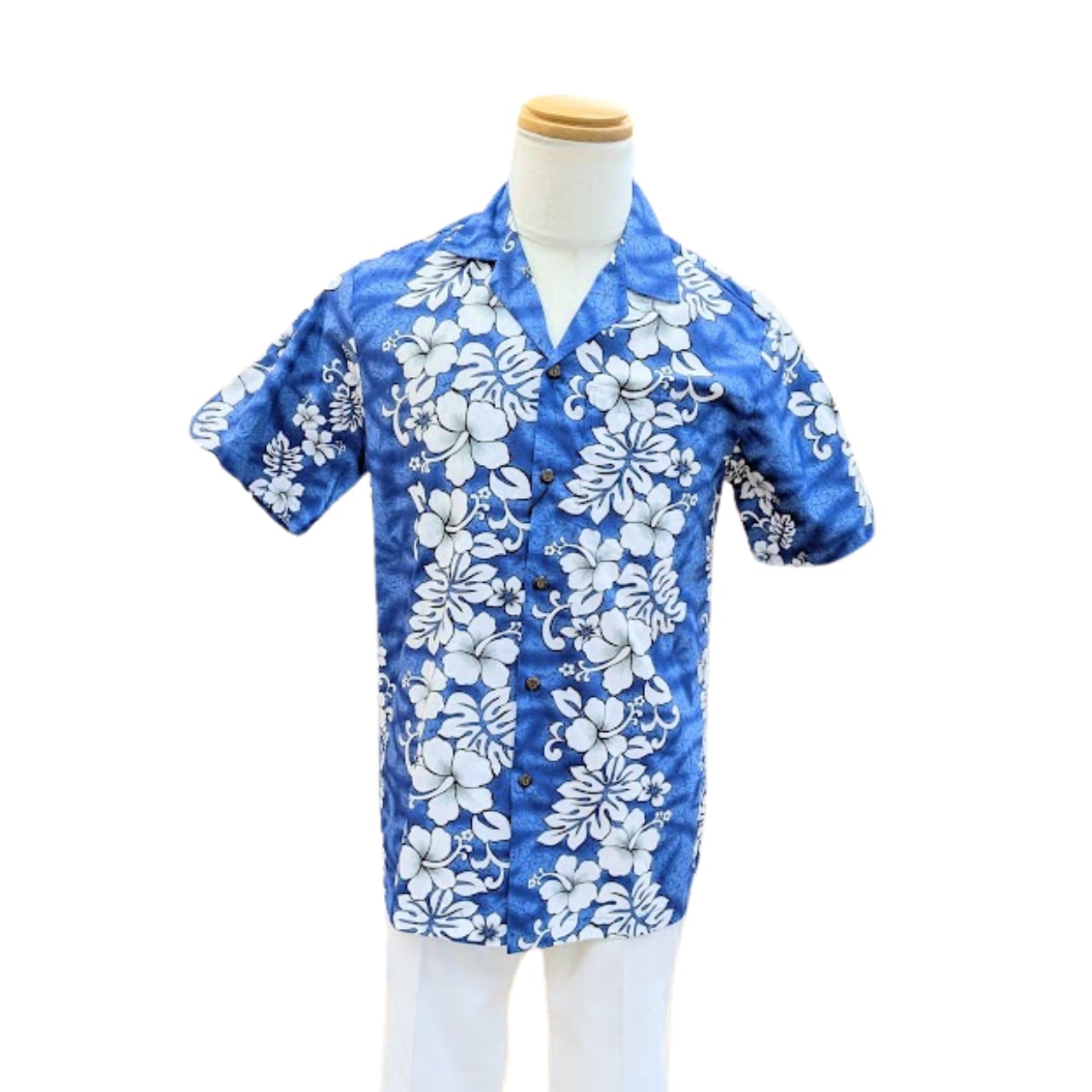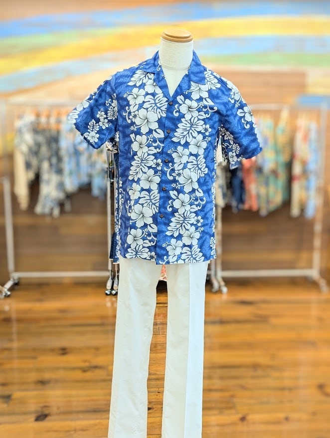袖を通した瞬間、ハワイの開放的な空気が流れ込むような一着です。 鮮やかなブルーに、縦ラインを強調するホワイトのハイビスカス柄が映える、クラシックながらも洗練されたデザインが魅力です。落ち着いたトーンのブルーなので、デニムやチノパンとも相性抜群!!幅広い年代の方が着ていただける上品な色味に仕上がっています。