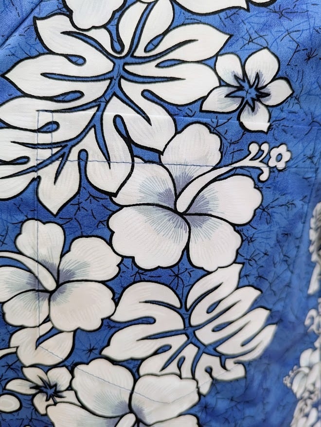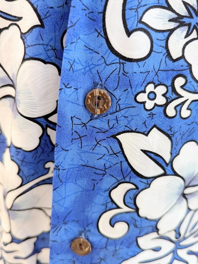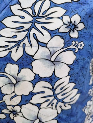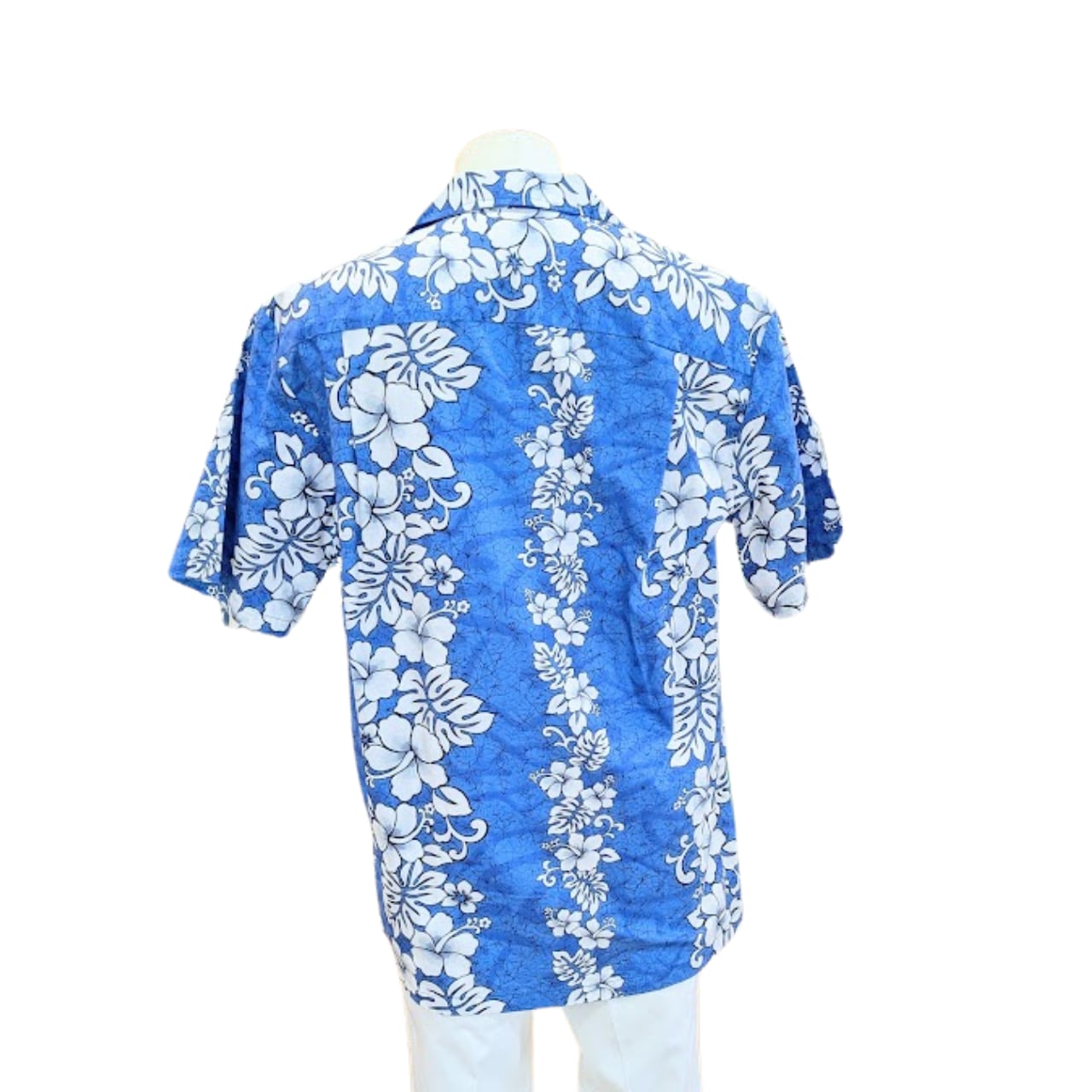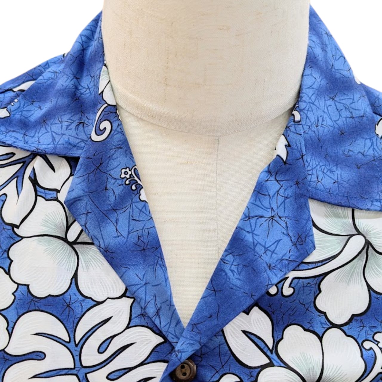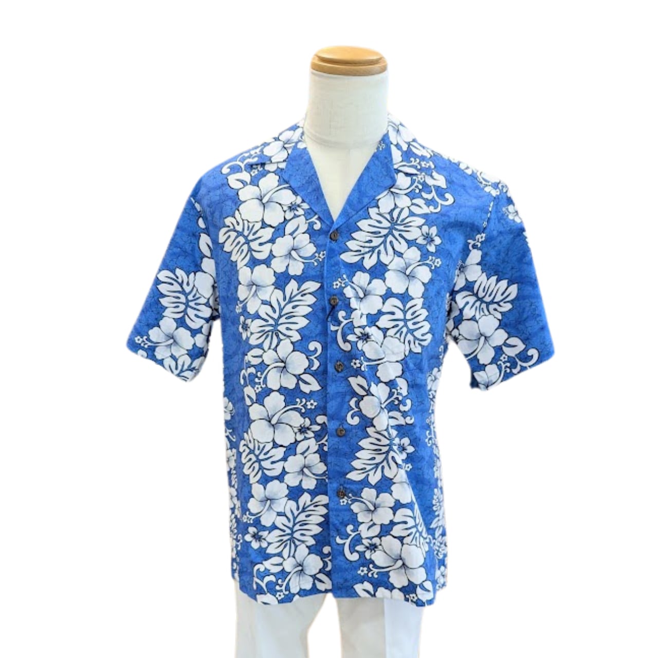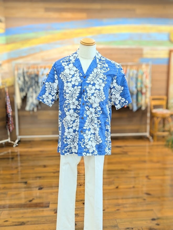 袖を通した瞬間、ハワイの開放的な空気が流れ込むような一着です。 鮮やかなブルーに、縦ラインを強調するホワイトのハイビスカス柄が映える、クラシックながらも洗練されたデザインが魅力です。落ち着いたトーンのブルーなので、デニムやチノパンとも相性抜群!!幅広い年代の方が着ていただける上品な色味に仕上がっています。