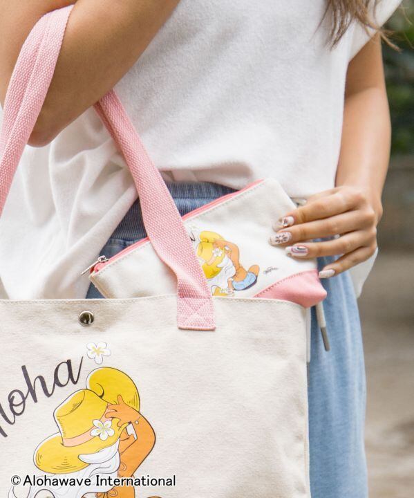 サーフィンとファッションを愛する365日ハワイを感じられるキャラクター、ALOHA MAPUA(アロハマプア)のデザイン。手のひらサイズながらマチ付きで収納力抜群。コスメや小物入れにぴったりで、バッグの中でも存在感のあるかわいらしいアイテム。