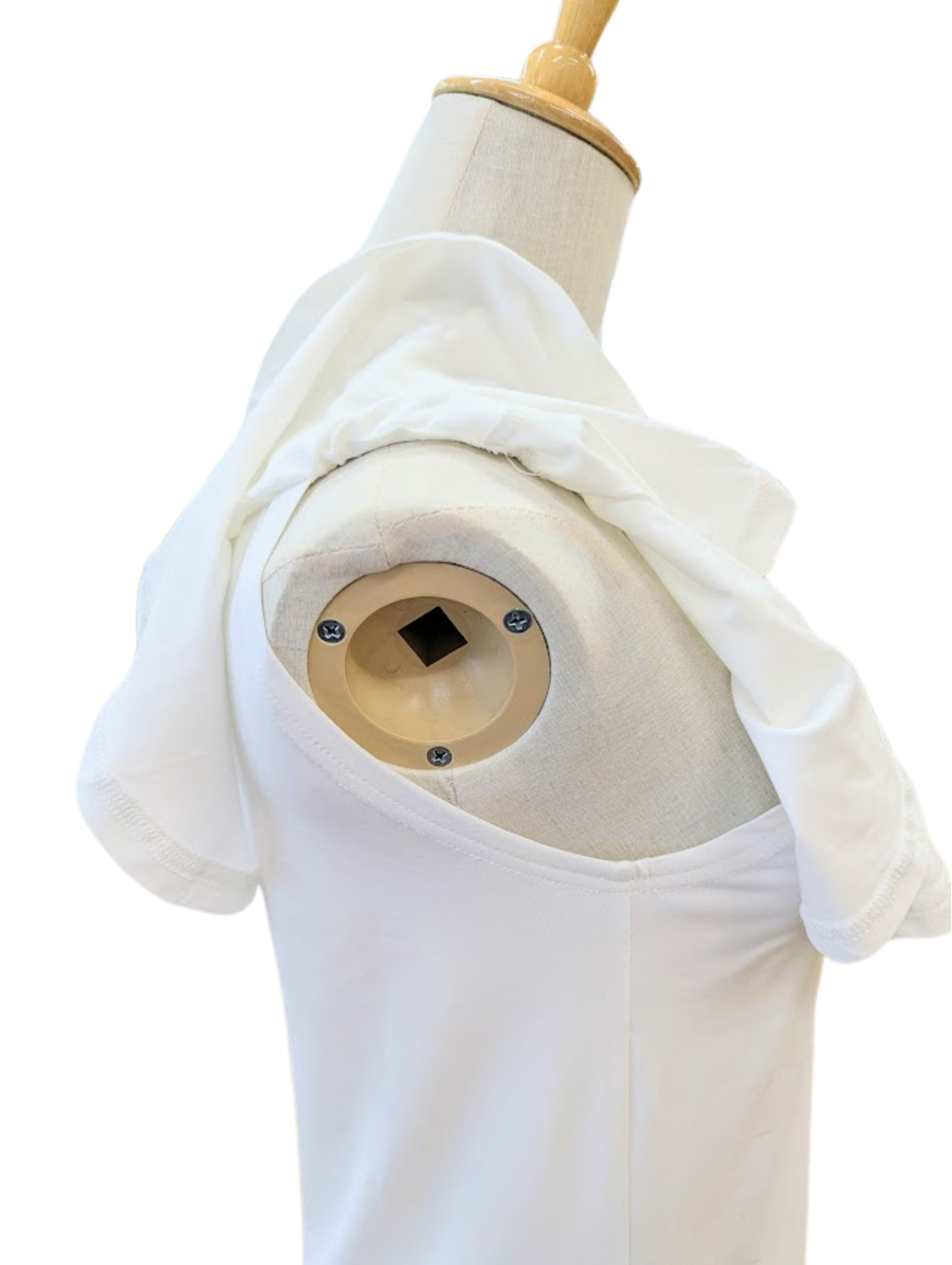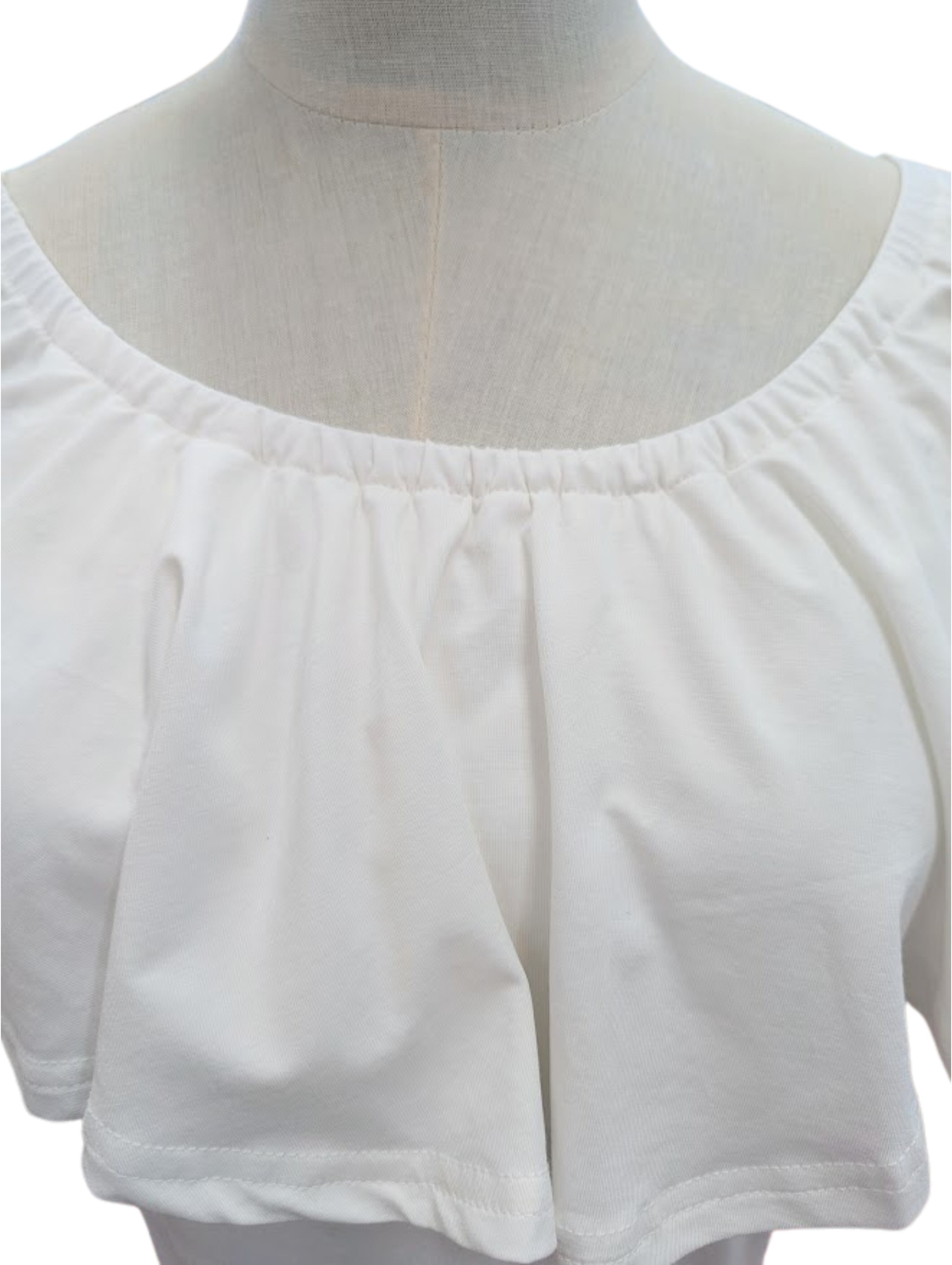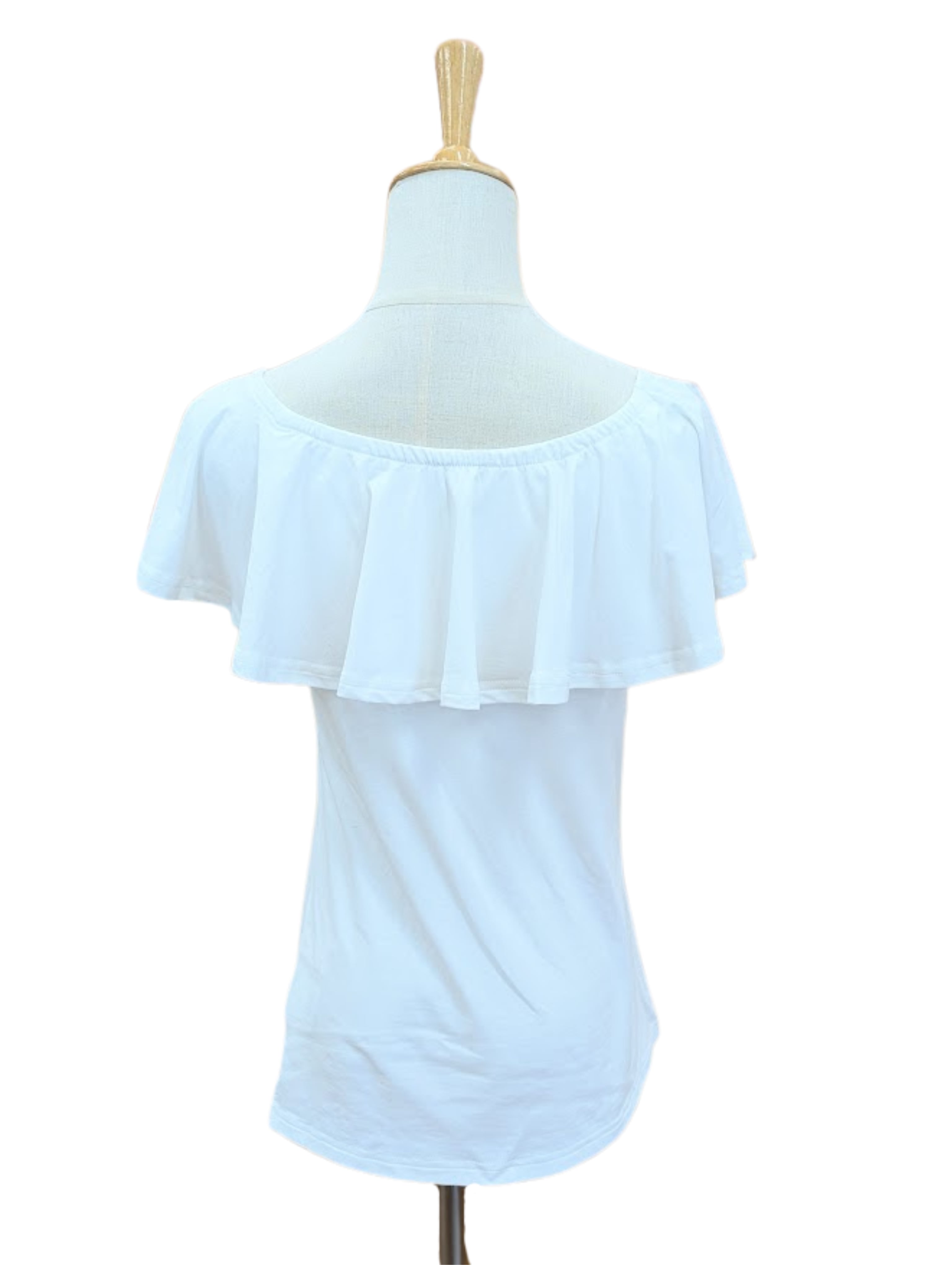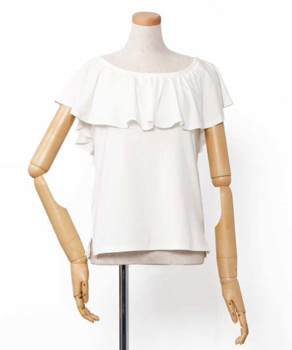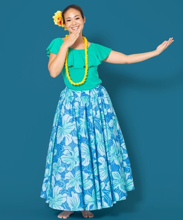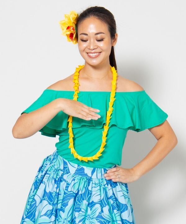 生地に程よい厚みとストレッチ性があり、オフショルダーやワンショルダーにアレンジ自在の万能トップス。幅広のフレアー衿は、フラの動きを優雅にみせてくれます。どんなボトムスにもマッチしますので、衣装としてはもちろん普段のコーディネートにもお楽しみいただけます。
