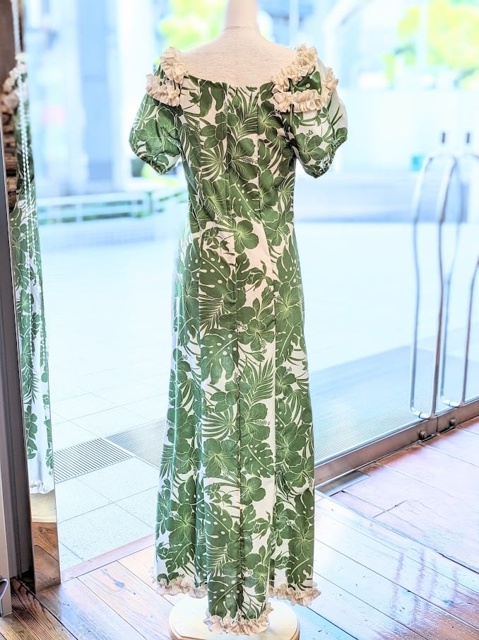 【Royal Creations】ハワイアンジェニーロングラッフルムームードレス(ハイビスカスパネル/グリーン)