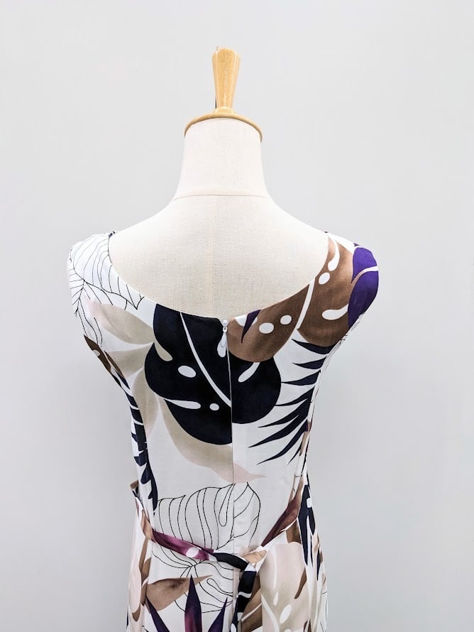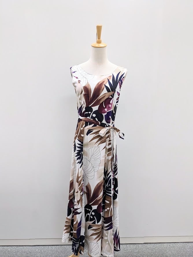 美しいジンジャー&モンステラのプリントが印象的なドレス。