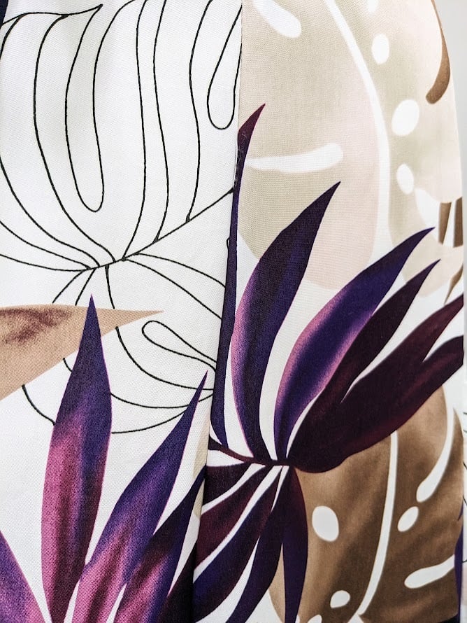 美しいジンジャー&モンステラのプリントが印象的なドレス。
