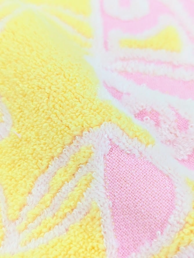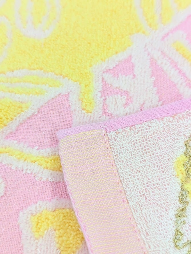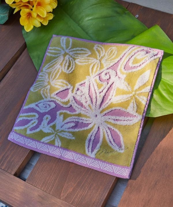 「幸福」の意味を持つティアレと伝統的なトライバル柄が大きく描かれたジャガードハンカチ。パイルの毛先をカットしたシャーリング加工によりとても肌触りのよい仕上がりです。可愛い色合いで描かれたデザインが魅力的。大切なOhanaへのプレゼントにも最適です。